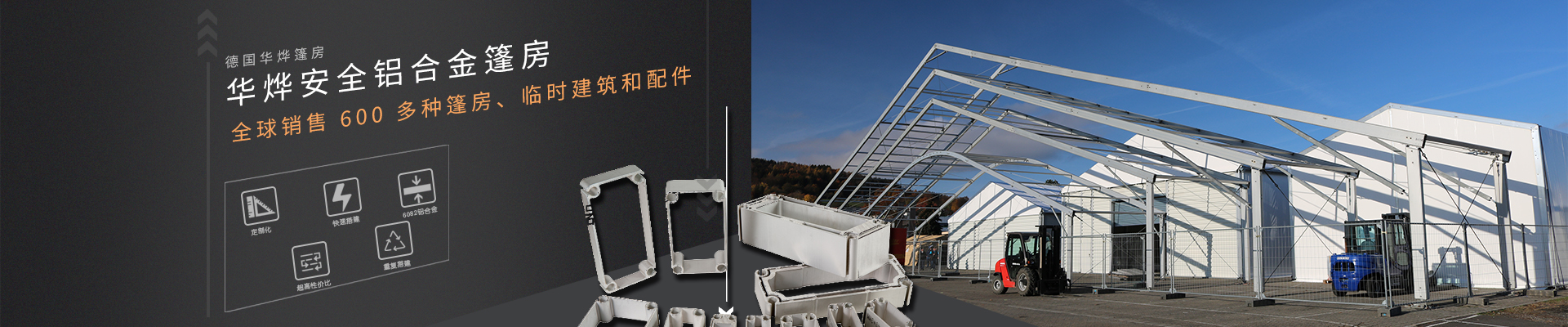 篷房主要有三大部分,鋁合金框架、連接鋼部件、各種材質(zhì)的頂篷及墻體。其中鋁合金與連接部件組成的框