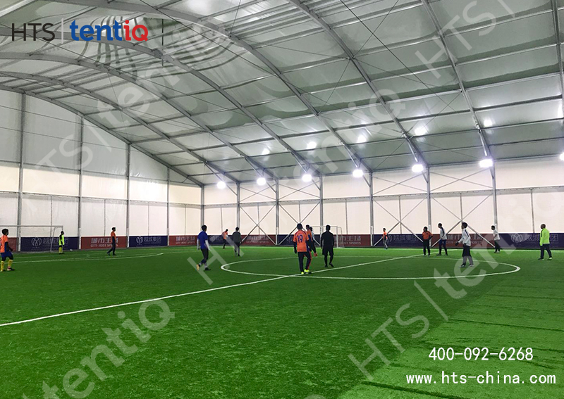 足球場篷房都可以滿足,華燁篷房可提供3-80米的寬度,長度是無限延伸,高度可以達到10米,內部無立柱,可以隨心所欲發揮球技,并且內部可隨意分割使用。四周還可以采用篷布或ABS墻體,保證在冬季訓練時抗寒防凍;在夏季來臨時,可以將周邊墻體拆除,起到通風降溫的作用。
