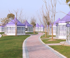 華燁篷房在設(shè)計(jì)整個(gè)營區(qū)的篷房時(shí),在保證安全的前提下,以美觀實(shí)實(shí)用為第一要素,最終決定采用多邊形尖頂篷房,神秘的紫色頂篷,四周全玻璃設(shè)計(jì),密封性能更好,實(shí)現(xiàn)空調(diào)恒溫,保證舒適度。